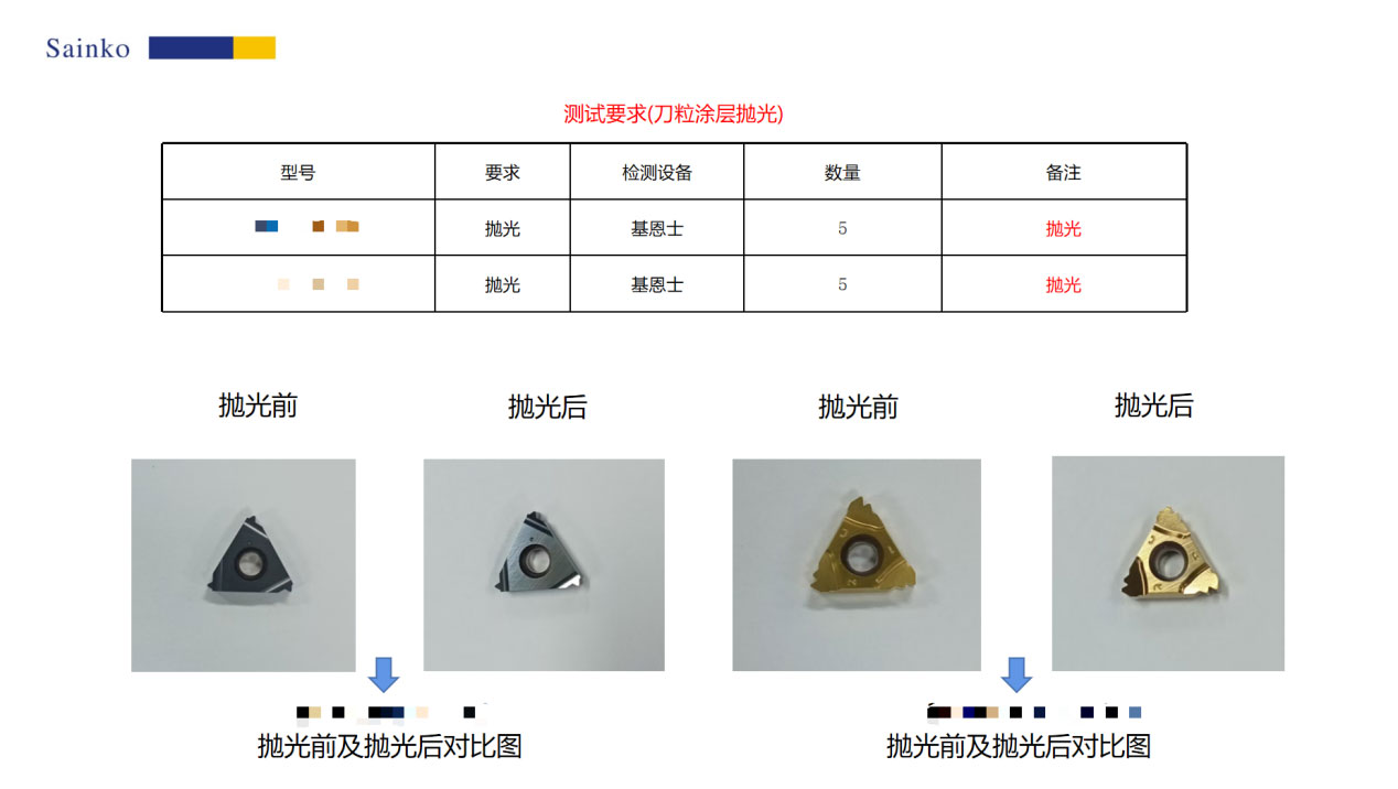 本次測試樣品為客戶提供的兩款刀粒,各5件,核心需求為涂層拋光處理。我司采用PL-12C設(shè)備及15000-L型號磨料進行加工,實現(xiàn)了涂層表面液滴去除,有效提升了產(chǎn)品表面質(zhì)量。具體測試結(jié)果詳見本報告。